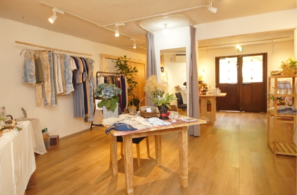 入り口を入ると、草木染めの色彩豊かなヨガウェアや、オーガニックで自然にやさしい雑貨・食品が並ぶショップスペースが広がります。サイドには、雰囲気の異なる2つのスタジオがあり、どちらも天然素材を活かしたナチュラルな空間です。