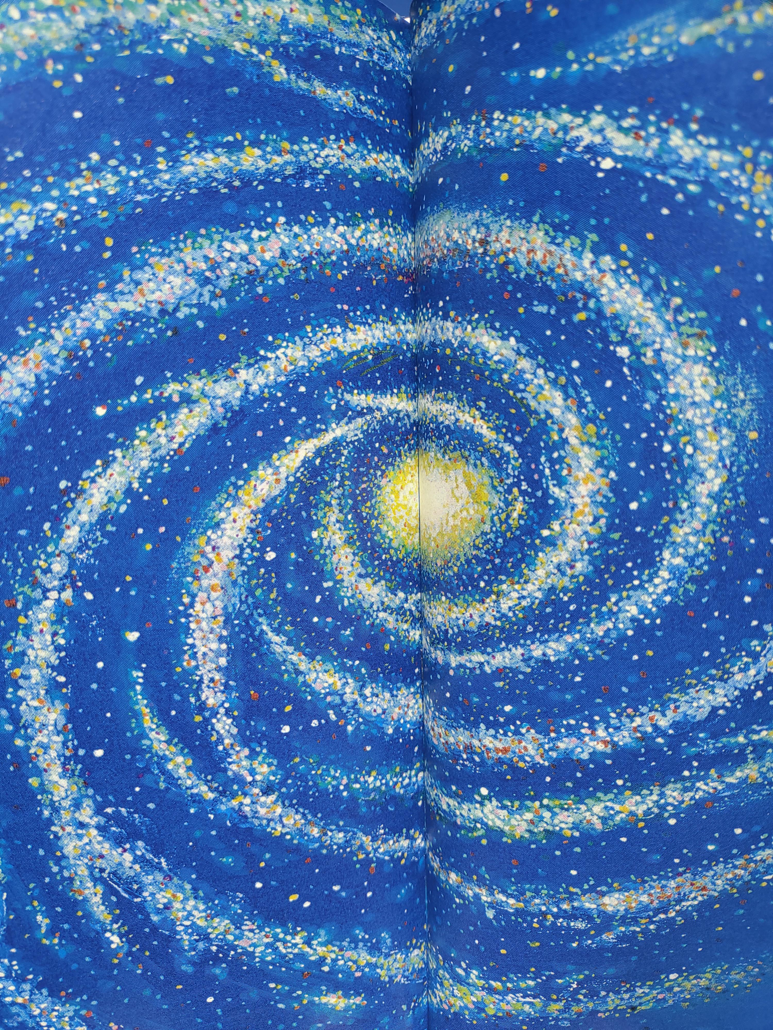 ぼくのいまいるところはどこでしょう。という言葉からはじまり、ここ、家の庭、街、日本、地球、太陽系、銀河系、大宇宙とひろがり、また大宇宙から、今ぼくがいるここへと戻ってくる。まさにヨーガ!瞑想!