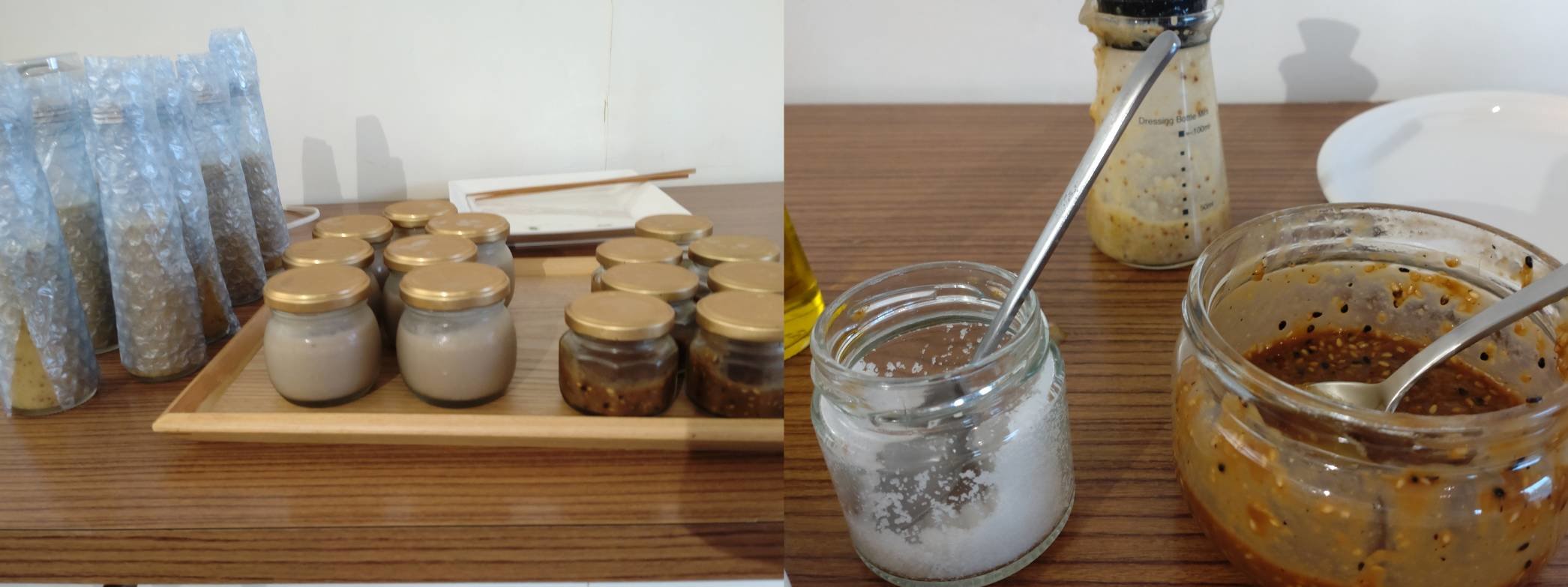私も実際に試食させてもらいましたが、瓶に入っている茶色の和え衣はゴマの香ばしさと醤油ベースの味がとても美味しくて野菜だけでなくご飯にも合いそうだなと感じました。背の高い瓶に入ったドレッシングは、やや酸味もあるため少しさっぱりとして美味しかったので、サラダがいっぱい食べられる感じです♫