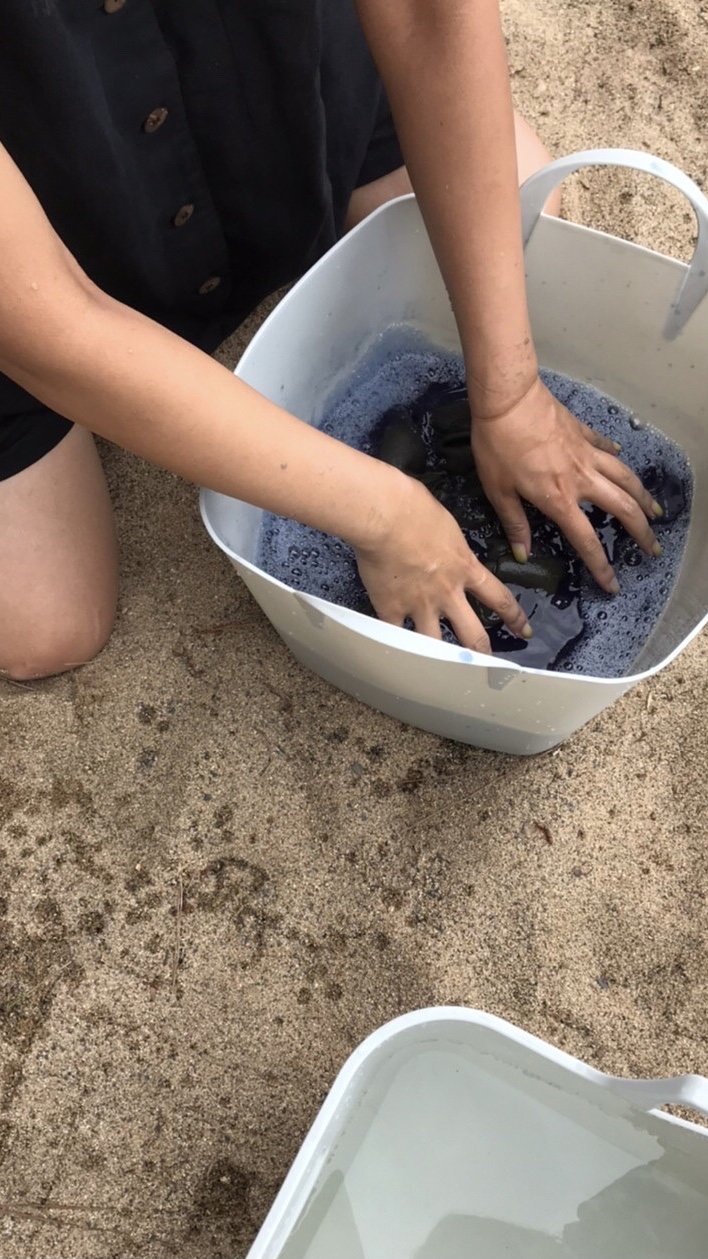 琵琶湖の水を汲んできて、好みの色を作ります。私は、ここ7年くらいずっと愛用していた、うすいマスタードカラーのリネンのワンピースに、藍色を染めてみました。もともとの色の上に色が重なって、なんとも、シックなカーキっぽい色になりました。美しい色にうっとりです。長年愛用しているワンピースが生まれ変わりました。自分で染めた一枚は、尚更愛おしいです♡