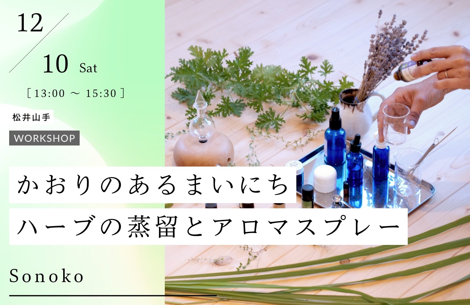 数種類のオーガニックハーブを使って蒸留を行い、フローラルウォータを抽出します。そしてアロマスプレー作りも行いますよ。身体も思考も忙しくなりがちなこれからの季節を、やさしく、そして力強いアロマのサポートをかりて、快適に過ごしましょう。蒸留中はみずみずしい香りが部屋中に広がって、しあわせな気持ちに。ぜひご体験ください!