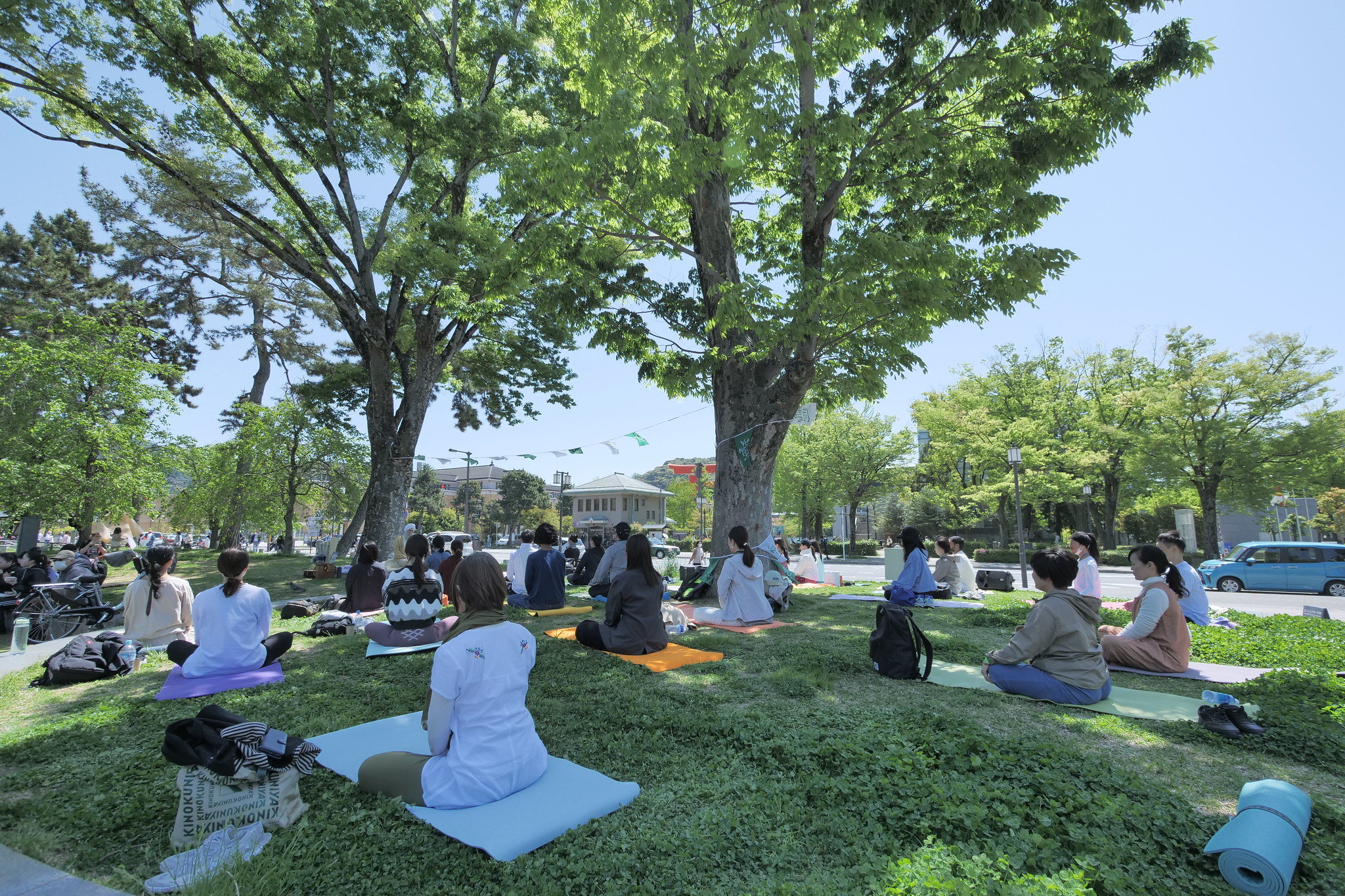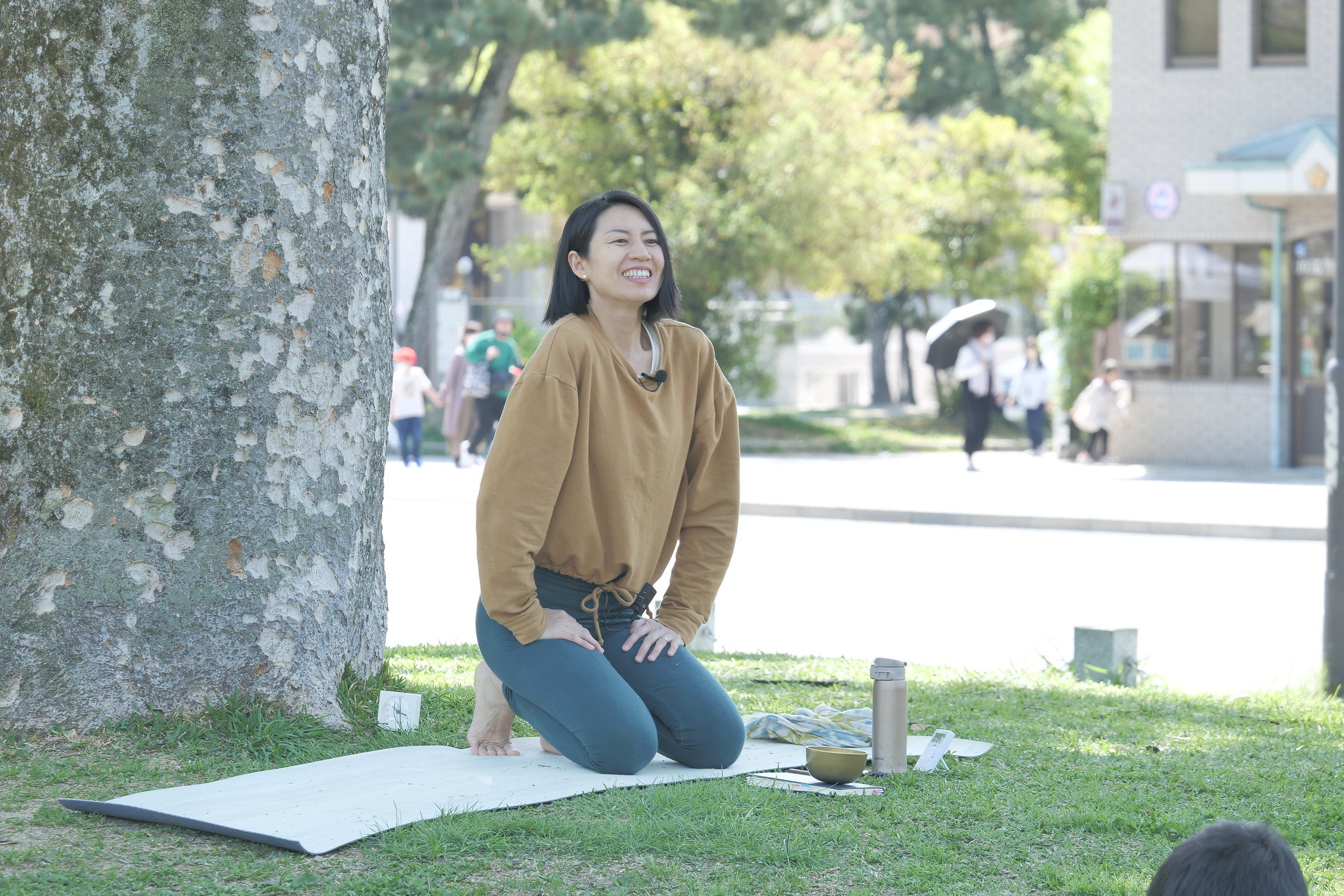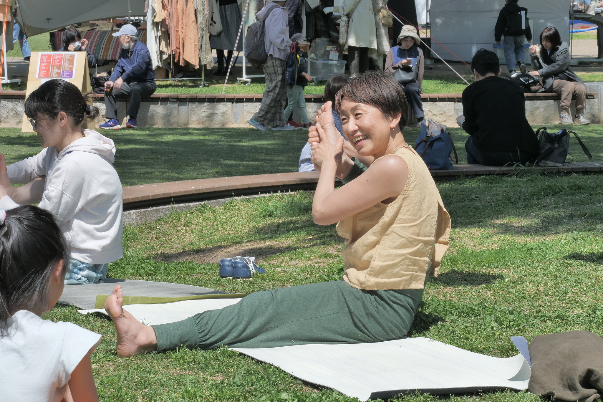 2日目も朝からたくさんの方にご参加いただきました!1日目より風もなく穏やかで、気持ちよさそうに全身をほぐしている様子でした!