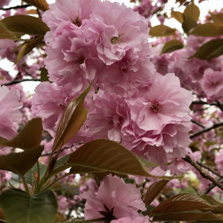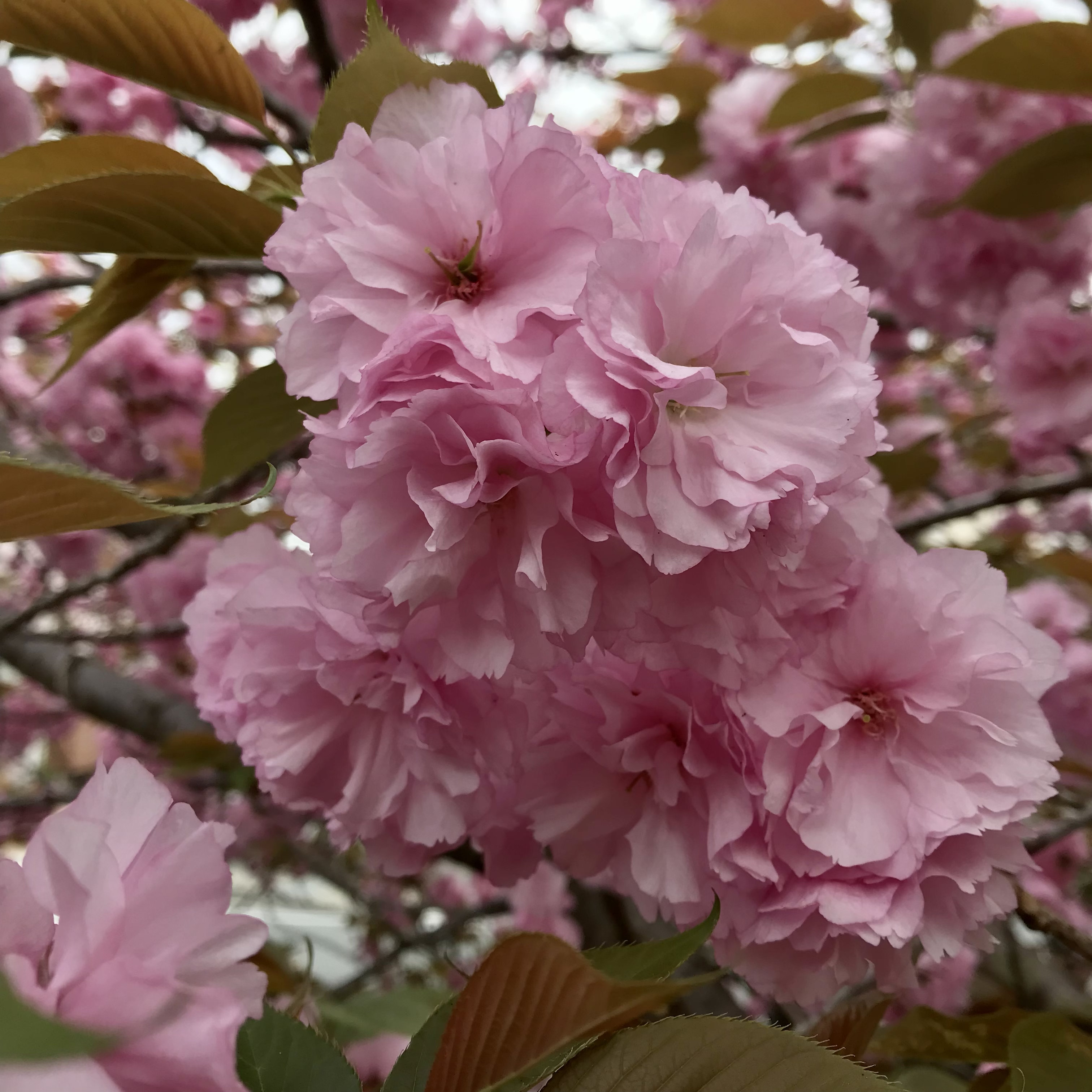 今日はひさしぶりに雨が降り続いていますね。自分の部屋から見えている木々が、日に日に若葉に覆われていく様子を眺めているのですが、この雨でますます緑色の景色が広がりそうです。八重桜も思わず笑顔になってしまうような可愛らしさで、しあわせな気持ちになりますね。
