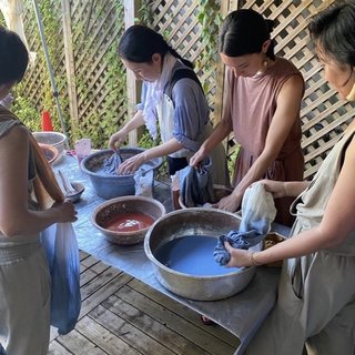 琵琶湖の水を汲んできて、好みの色を作ります。私は、ここ7年くらいずっと愛用していた、うすいマスタードカラーのリネンのワンピースに、藍色を染めてみました。