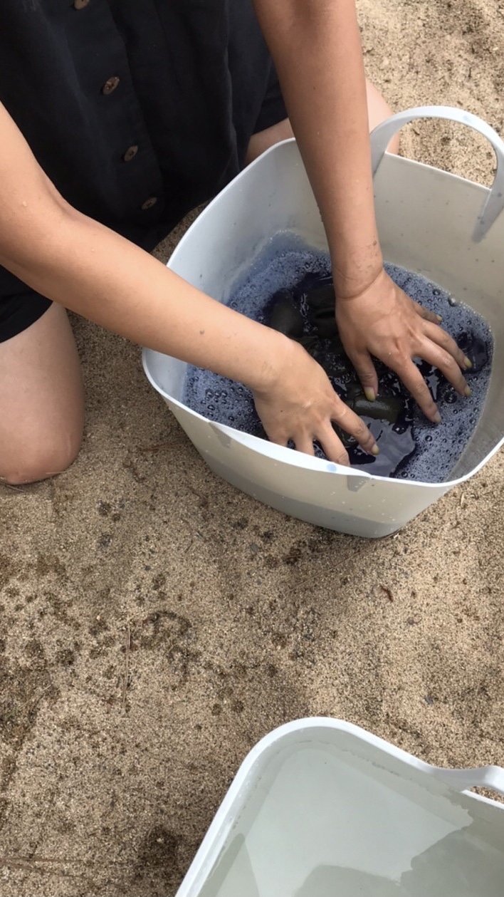 琵琶湖には、たっぷりの水があるし、ベンガラ泥染めには最適なロケーションだということが分かりました。必要なものは、バケツか何か、染料を水につけてバシャバシャできる容器と、染めたい素材のみです。