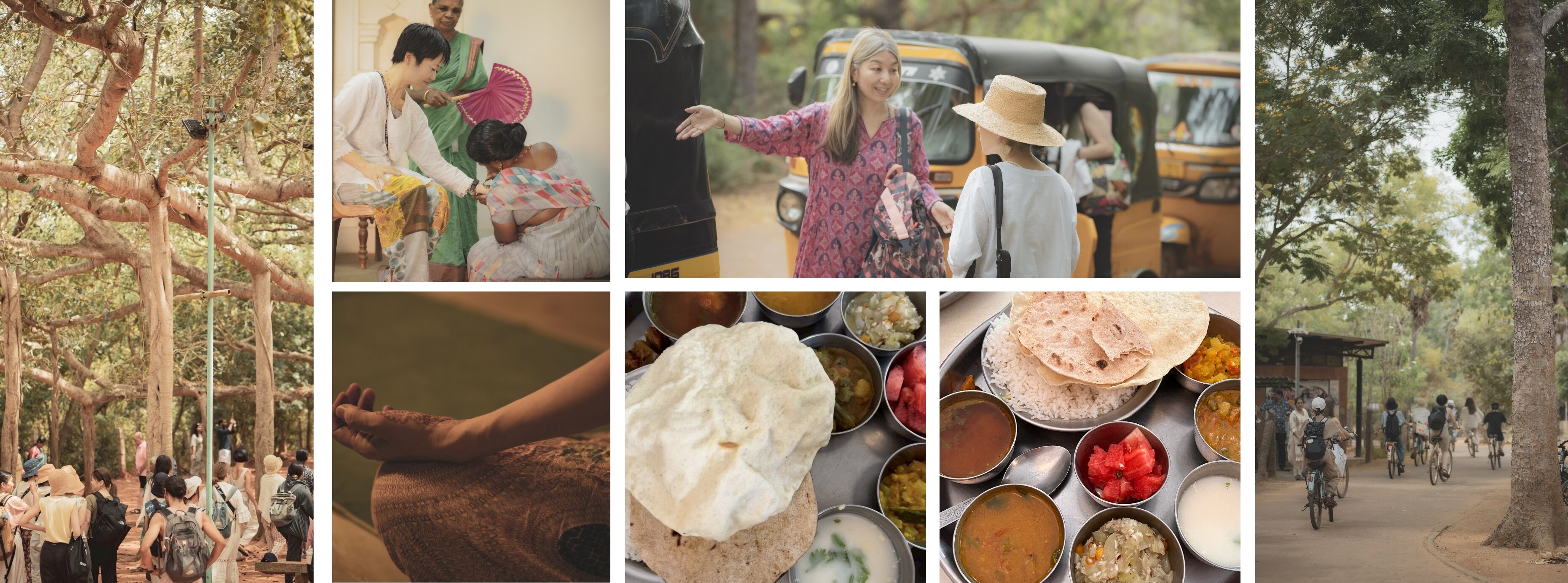 オーロヴィル滞在中は、毎日のヨガの練習やマトリマンディルでの瞑想体験を予定しています。そのほか、歴史的な寺院や博物館、インドの民族芸術を取り入れた本づくりで有名な出版社、タラブックスを訪れたり、おいしいベジタリアンのお食事や、地元の方々で賑わうチャイスタンドなども一緒に楽しみましょう。