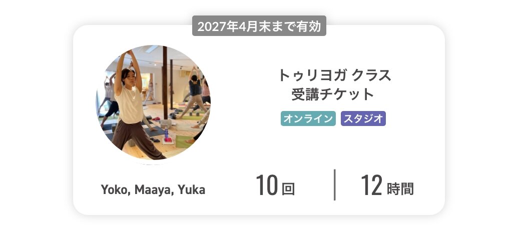 トゥリヨガクラス受講チケットは、TAMISAの10回チケットに該当します。 トゥリヨガの全てのオンラインクラス、スタジオクラスで使用可能です。(有効期限:2026年9月25日〜2027年4月30日)