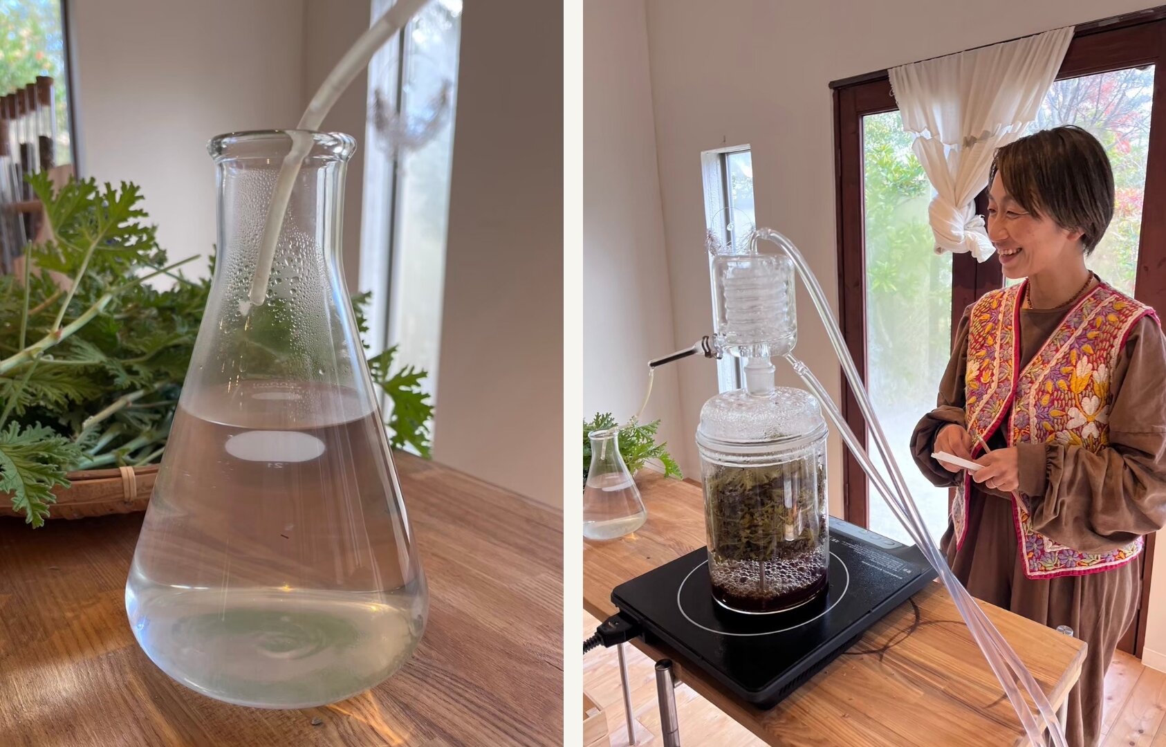 フランスのアロマファームのタイムリナロールとラベンダー、Sonokoファームのゼラニウムなどハーブをブレンドして蒸留します。